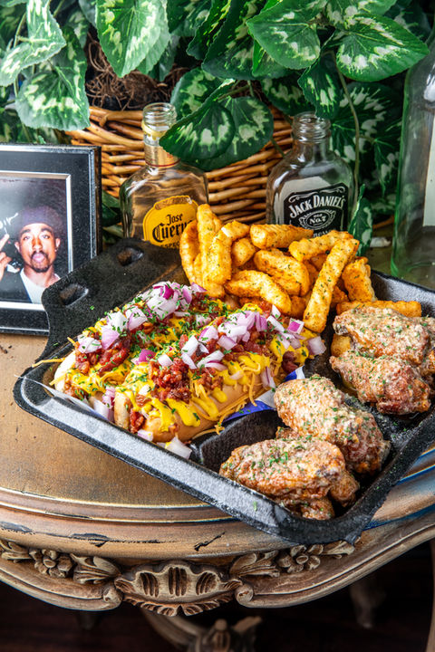 A GLIZZY is a MF burnt hot dog topped with our homemade chili cheese, bacon, mustard and onions